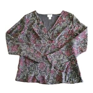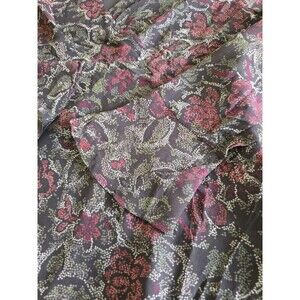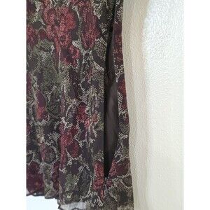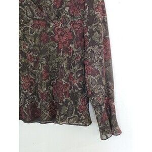 The Ann Taylor LOFT Women's Top Blouse in size 14 is a stylish and versatile addition to any wardrobe. Made from 100% silk chiffon, this long sleeve blouse features a beautiful floral pattern in a vibrant green, brown, dark blush pink color. The V-neckline, bell sleeves, and zip closure add a touch of elegance, making it suitable for travel, casual outings, or business meetings. This lightweight and sheer blouse is perfect for the summer, fall, and spring seasons, and is lined for added comfort. The designer brand and bohemian theme make it a chic and trendy choice for any fashion-forward woman.