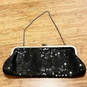 LOFT Ann Taylor black sequin evening bag. Silver chain handle can be tucked into bag to convert to a clutch.