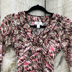 Ann Taylor LOFT brown and pink v-neck top with 3/4 length sleeves and a belt. Materials 94% polyester, 6% spandex. Measurements: underarm to underarm - 16”, shoulder to bottom - 24”, underarm to bottom - 16 1/2”. Size XS.