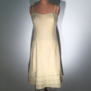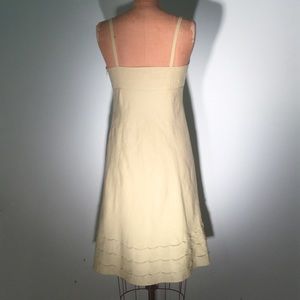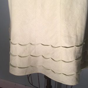 Super sweet petals line the hem of this sundress. 3 rows of horizontal self pleats that create a unique soft petal effect just above hemline. Ann Taylor LOFT linen in margarita green! Empire waist with self piping below bust. 100% linen, lined, side zip. Size 2, but must run a bit large as it fits my size 4/6 mannequin. 30"ish below bust, 34"ish bust, 37"ish hips.