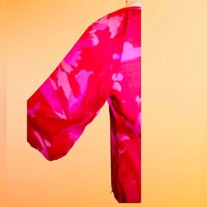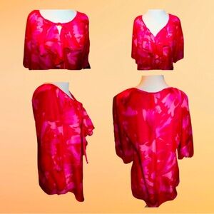 Beautiful red and pink floral sheer fabric top with elastic 3/4 length sleeve ends, tied center front top with draping front ruffles! Light and airy for Summer! In like new condition
