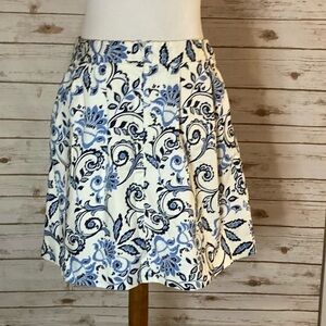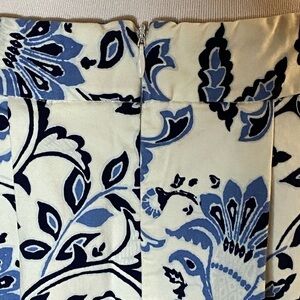 Blue and white paisley/floral pattern; 1.5” waistband; two side pockets; hidden back zipper