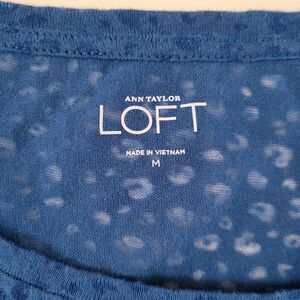 This roundneck pullover by Ann Taylor LOFT is a teal shade of blue in a burnout animal print, making it a semi-sheer top. It's a nice choice for cooler spring or summer days-perfect for chilly going out vibes. This breathable and lightweight shirt works well as a layering piece year round. (Care tag is missing, and info was obtained from website.) In very nice condition.