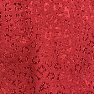 Beautiful red lace sheath style mini dress by Ann Taylor in size 8. Deep red lace overlay with a matching red nylon underdress. Short sleeves and hemline are both lace edged with ruffle detail. Rear zipper. Cotton/polyester/nylon fabric.