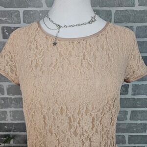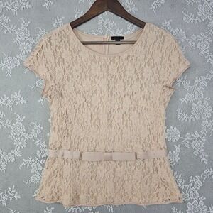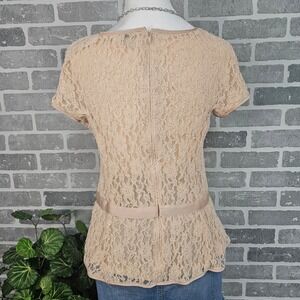 Ann Taylor Lace Top Blouse Women's 6T Peplum Bow Belt Short Sleeve Peach Career