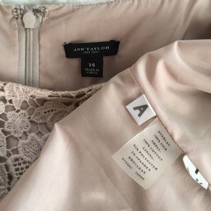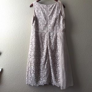 Beige/taupe/clay-colored lace and silk sheath dress, fully lined, back zip. Dry clean only. May need dry cleaned.
