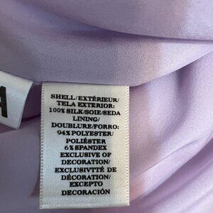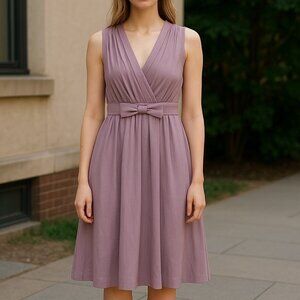 Chic lavender mini dress. V-neck with bow accent. Ideal for versatile styling.