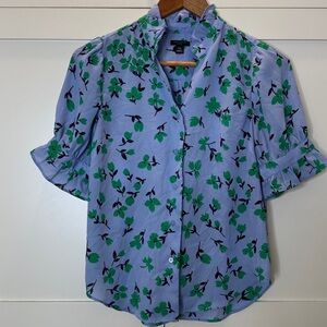 Elegant blouse with floral design. Features puff sleeves and a classic collar. Ideal for versatile styling.