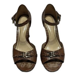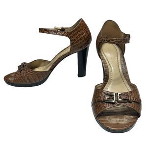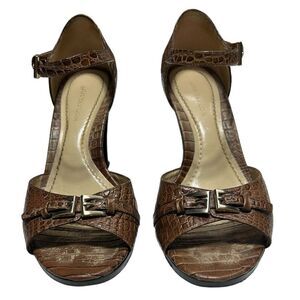 Ann Taylor Leather Brown Heels Open Toe Snakeskin Pattern Ankle Strap Block Heel