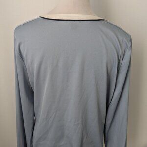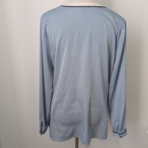 Ann Taylor flowy and semi-sheer long-sleeve blouse. Light blue with white panels and black accent around the neckline and cuffs. One button on each of the cuffs. 100% poly. RN 77879. Size medium. Two small untreated spots but appear to be from detergent so it should come out fairly easily.