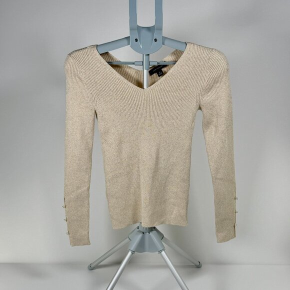 This beautiful Ann Taylor sweater features a lovely light golden/cream color with elegant pearl cuff details. The shimmering fabric makes it perfect for a night out, adding a touch of sparkle to your evening.
