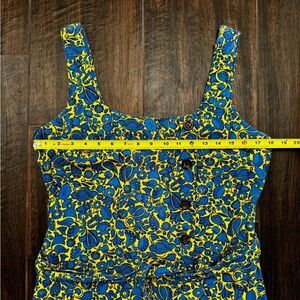 This Ann Taylor sundress features a vibrant blue hue with a delicate floral print, perfect for casual resort wear. The sleeveless design and square neckline offer a breezy, comfortable fit, while the midi length adds a touch of elegance to your summer wardrobe.