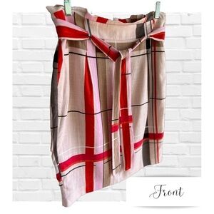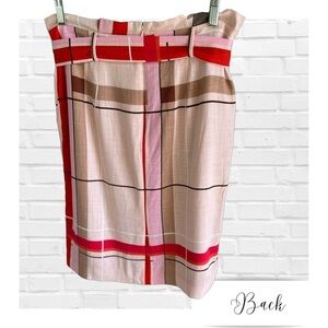This is a great skirt from Ann Taylor. It is so colorful with light and bright pinks, red, orange, and brown colors in a large plaid or stripe pattern. It is a linen blend with the look of 100% linen due to the fabric texture. It features a removable belt and two side pockets. It also zips down the back. It is new with tag. Back slit is still sewn and vent has not been opened. See last photo.