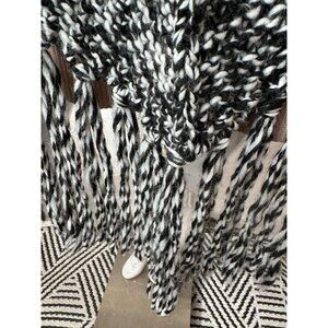 In a world where comfort meets style, this poncho becomes a cozy companion for chilly days. Its intricate black and white knit design wraps you in warmth while the playful fringe adds a touch of whimsy. Crafted in Italy, it exudes timeless elegance and versatile fashion.