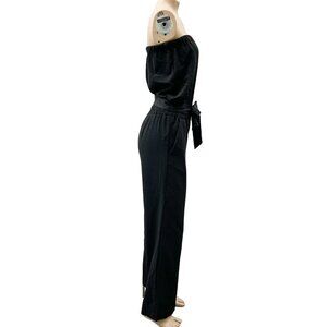 Tags: Women's jumpsuit, black jumpsuit, Ann Taylor Loft, off-shoulder, XS jumpsuit, polyester fabric, chic outfit, stylish jumpsuit, women's fashion, elegant attire, full-length pants, elastic waist, tie belt