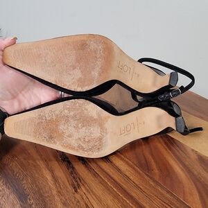 Step out in style with these elegant black heels. Perfect for any occasion, these shoes offer both comfort and sophistication. Elongated toe provides a sleek silhouette. Dainty ankle strap with adjustable buckle closure. Short kitten heel. Velvet uppers. Leather lining.