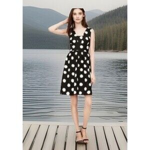 The Ann Taylor Loft Black Ivory Polka dot dress in size 8 is a stylish and versatile piece for both special occasions and professional settings. This sleeveless dress features a flattering A-line silhouette and a knee-length hem, perfect for a cocktail party or office event. Made of comfortable cotton material with a lined interior, this dress is suitable for warm weather in the summer, fall, or spring seasons. The black and white polka dot pattern adds a chic touch, while the zipper closure ensures a secure fit. Ideal for women looking for a sophisticated yet trendy dress option.