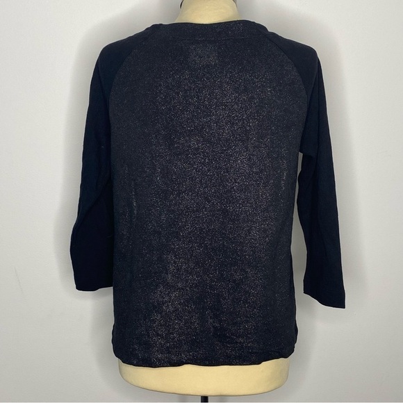 Ann Taylor Loft Black Sparkle Metallic Top. Solid black quarter length sleeves, body has silver sparkle in fabric. Asymmetrical zipper on left shoulder. Has the feel of a light sweatshirt.