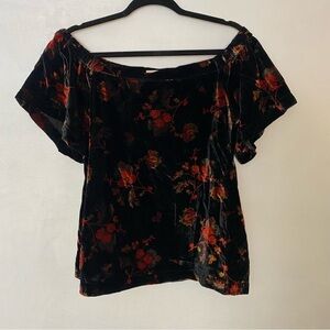 Black velvet off the shoulder top with all-over amber floral print and romantic flutter sleeves.