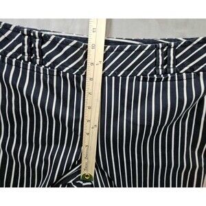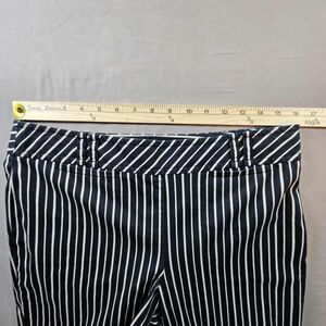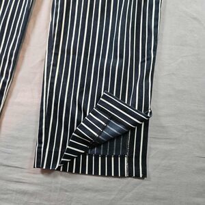 Chic and modern Ann Taylor Loft dress pants in a black and white striped pattern. Features a side zip closure, flat front design, two back button pockets, belt loops, and subtle ankle slits for a tailored finish. Classic style that transitions easily from office to evening.