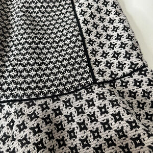 This skirt features a black and white geometric pattern with a peplum ruffle flair design, giving it a playful and feminine look. The skirt is mini-length, falling above the knee, and has a fitted waistline to accentuate the figure.