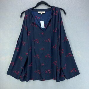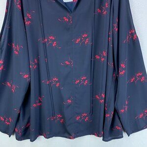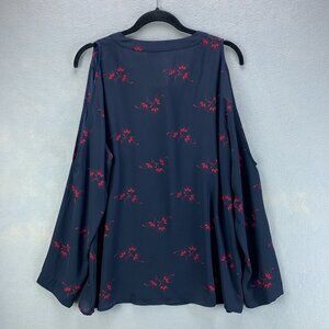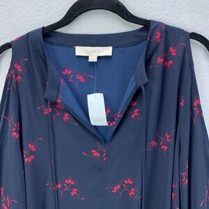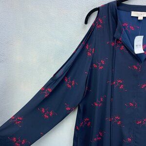 Ann Taylor Loft Blouse Womens Large Blue Red Floral Cold Shoulder Semi Sheer