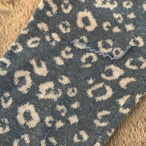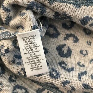 A cute lightweight sweater from Loft. I did notice a few small snags shown in the pictures, but no holes or stains. Love the animal print and fun blue color of this sweater!
