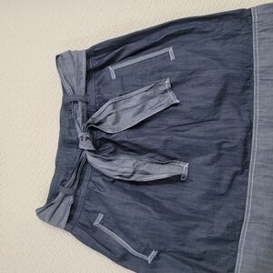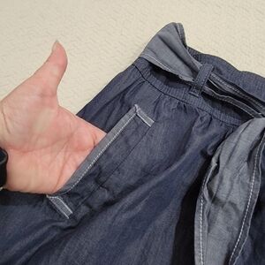 Pretty colorblock chambray blue and gray skirt. Front pockets. Sash ties. Flared. 100% cotton.