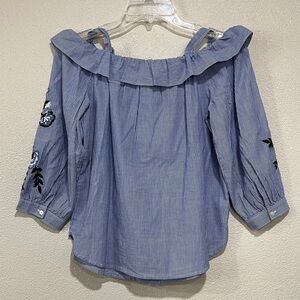 Ann Taylor Loft Blue Striped Off-Shoulder Top with Floral Embroidery