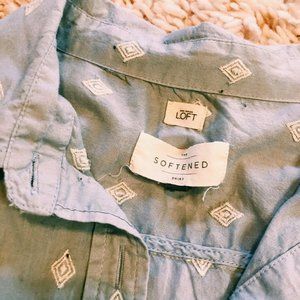 Ann Taylor Loft. Light blue. The softened shirt. Size small, TTS. White embroidered diamonds on the front. Button up. Button on each sleeve. All buttons original and working. Double pocket on front. Thin and great for layering. 100% cotton.