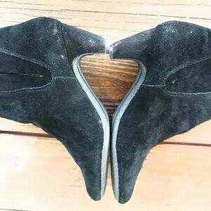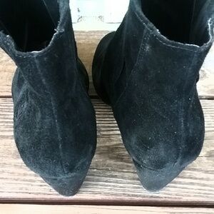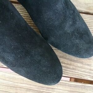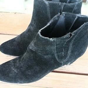 These booties are pre owned a do have a few flaws. There are some worn spots in different areas and on the heels (see pics). Having said that the camera actually magnifies these flaws much more than in person. These are not b noticeable unless you are looking close at the shoe . These are very nice black suede leather with gussetted sides and are pull on type. The heel height 3".