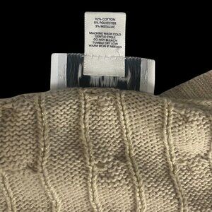 Elevate your cold-weather style with this charming Ann Taylor Loft cable knit sweater! This medium-sized piece combines cozy warmth with a touch of glam thanks to the subtle gold flecks throughout. The classic cable knit design is complemented by a soft, ivory base, making it versatile enough for both casual days and festive occasions.