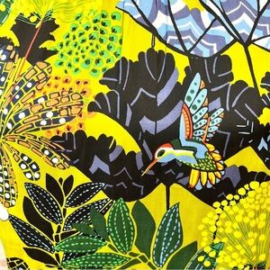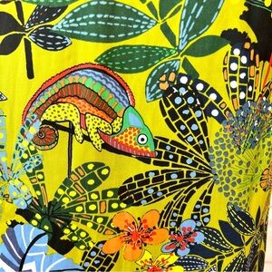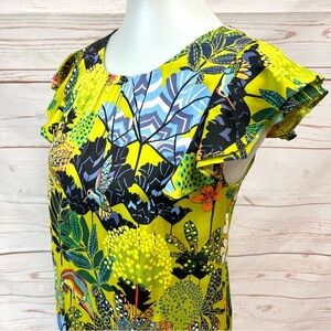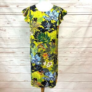 Ann Taylor Loft Chartruese Tropicalia Jungle Animal Print Shift Dress. Lizard, Hummingbird, Botanical leaf and bold florals. Ruffle sleeves frame a loose fitting shift dress. Size Small and can also be sized up to a Medium. There are a few holes in the back that the pattern covers up. But it’s still so cute!