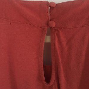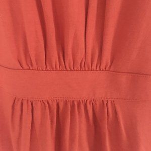Cotton coral dress. Above knee to knee length. Very very tiny hole to on left back shoulder (see photo near button enclosures), otherwise no rips/tears/stains.