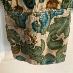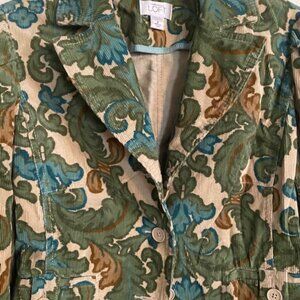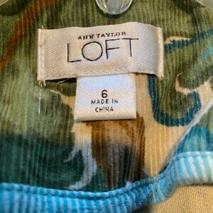 In like new condition is a beautiful Ann Taylor Loft baby corduroy blazer, great colors (olive green, turquoise, brown, creme), two front pockets, would look great with jeans or pants, classic look, women's size 6