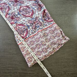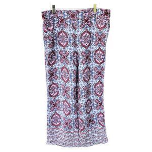 The product is a pair of Ann Taylor Loft Palazzo Pants in size L, designed in a pink Moroccan pattern. These wide-leg pants feature an elastic waist for comfort and easy pull-on styling. Made from a rayon blend fabric, these stylish pants are perfect for women looking for a chic and trendy addition to their wardrobe. Excellent condition. See pictures for measurements