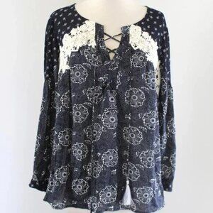 Ann Taylor Loft Dark Floral Print Lace Tassel Peasant Boho Long Sleeve Blouse - Great for the office, date night or everyday wear. Classic and trendy and flattering. Flowy top. Dark navy blue, almost black and white print. Tie neck with tie tasseled, Balloon long sleeve, Pullover style, Dark floral printed, Oversized fit and is so comfy!