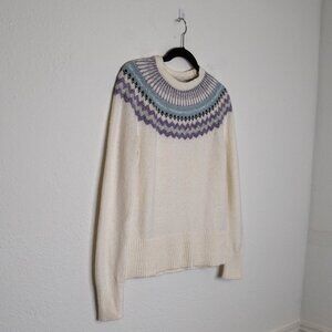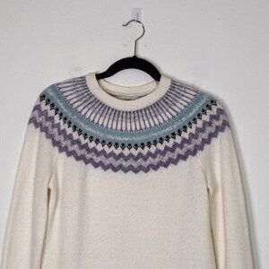 Pre-owned, good condition. No visible holes or stains. Some pilling throughout. Ann Taylor Loft. Beautiful Nordic knit design in shades of gray, light blue, lilac and black with a few metallic threads for some extra glam over a neutral cream background. Crew neckline. A bit oversized. Ribbed neckline, cuffs and hem. Soft. Size per tag: S (Small). Knit blend: 44% Acrylic/ 37% Nylon/ 12% Polyester/ 6% Wool/ 1% Other fibers. Size per tag does not guarantee desired fit, please see pictures for measurements.