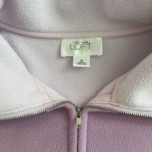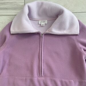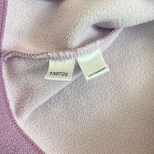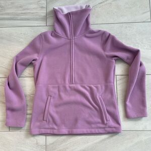Size Medium Cowl Turtle Neck Lavender Half Zip. Beautiful light purple/lilac/lavender color with contrasting lining. Versatile neckline can be worn variety of ways. Kangaroo pocket in front. Measures 19 inches across chest underarms and 23 inches long from shoulder. Defect on right lower sleeve, fleece texture is worn down, see last photo.