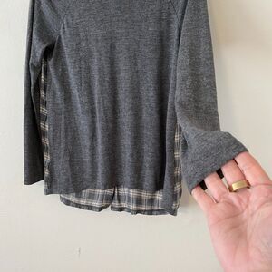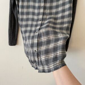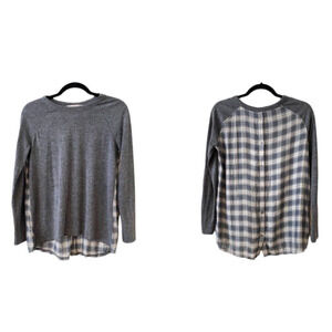 Ann Taylor Loft High Low Charcoal Gray Top With Gray Blue Cream Plaid Button Down Back Long Sleeve Tee Shirt
