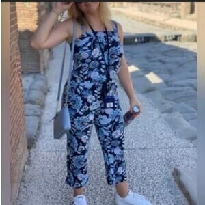 Ann Taylor Loft Jumpsuit Size 8 Blue Floral Print Square Neck Boho Casual Rayon