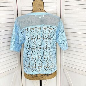 Light powder sky blue, Laser cut lace, Flower blossoms, Mesh shoulders, Ribbed crew neck, Short sleeve, Crop length, Pullover, Sheer