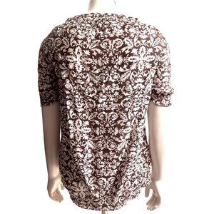 Discover timeless versatility with this Ann Taylor LOFT blouse, Size Large, in a rich brown and white damask floral print. Crafted from a luxe cotton-silk blend (70% cotton, 30% silk), it features a ruched button front, tassel tie neckline, and softly puffed sleeves. Lightweight and romantic, it pairs effortlessly with tailored trousers for day or with denim and heels for an evening in the city.