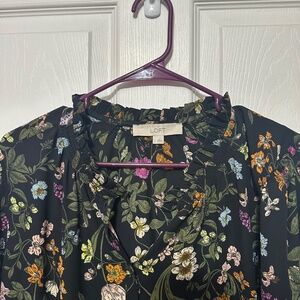 Ann Taylor Loft size large. Ruffle V neck and ruffle collar. Long sleeve black blouse with vibrant colored flowers. 3/4 button up in front.