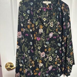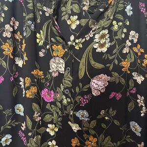 Ann Taylor Loft Large Long Sleeve Black V Neck Blouse With Vibrant Flowers