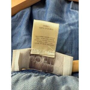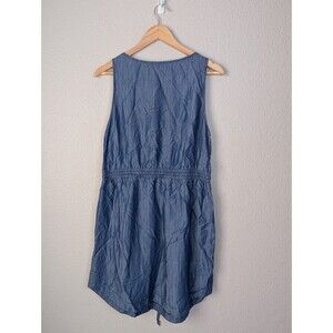 Ann Taylor Loft lyocell blue jean chambray sleeveless dress in size Large. This knee-length dress features a collared neckline, drawstring closure, and solid pattern. It is machine washable.