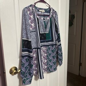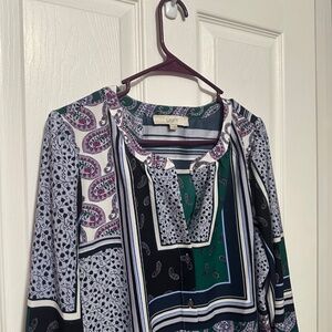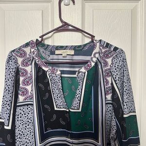 Ann Taylor Loft size medium. Gorgeous long sleeve blouse with unique designs and pops of purples and greens in a pretty pattern. Buttons up front.