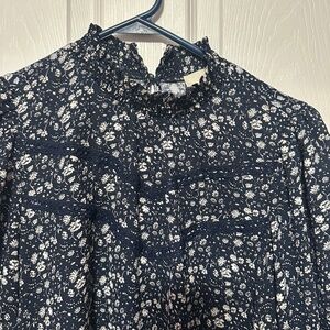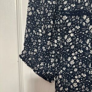 Ann Taylor Loft Size medium short sleeve navy blue blouse with white floral design. Unique navy blue eyelet design across chest. Sleeve hems are ruffled. Cute keyhole back.