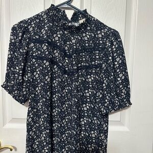 Ann Taylor Loft Medium Short Sleeve Navy Blue Blouse With White Florals