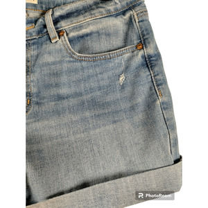 This is a pre-owned pair of Ann Taylor Loft mid-rise roll cuff cut-off denim shorts. They are factory distressed and have a raw hem that rolls to a cuff. They have a button and zip closure, 5 pocket styling, and belt loops. There are no visible flaws.